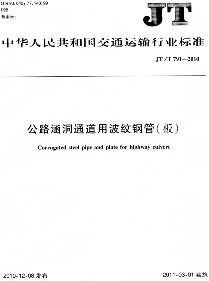 交通部《公路涵洞通過波紋鋼管(板)》JT/T791